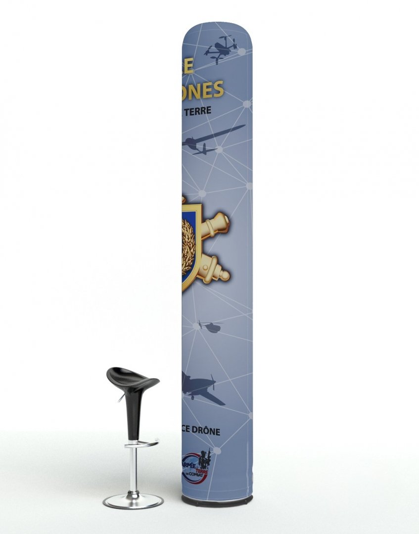 Constituée d'une structure en PVC gonflable habillée par une toile imprimée en sublimation numérique allover. Socle lestable pour une utilisation intérieur et extérieur. Cette colonne ne nécessite pas d'alimentation électrique continue. Gonfleur électrique 600 W et housse de transport inclus. Impression quadri comprise. Poids : 5 kg. Dimensions : Ø 45 x 280 cm.
