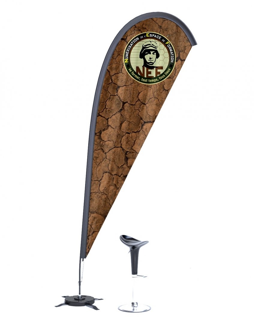 En matière 100 % polyester. Mât en fibre de carbone. Fourreau noir Oxford 300 d. Les mâts se fixent sur tous les pieds de la même manière. Axe de rotation 360°. Les voiles se tendent sur tous les mâts grâce à un élastique. Garanti pour un vent inférieur à 70 km/h. Impression quadri comprise. Poids : 11,7 kg. Dimensions : 110 x 350 cm.