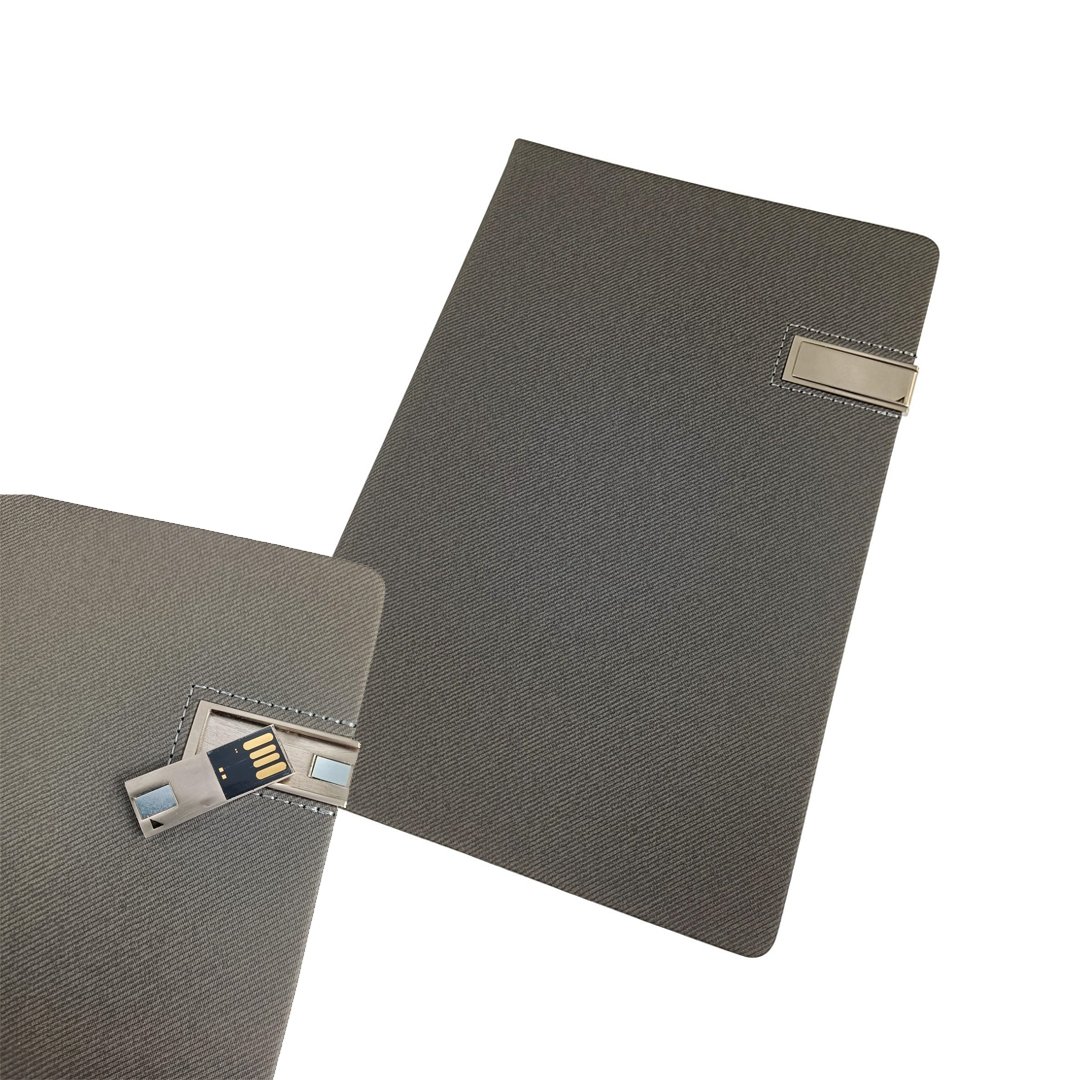 Format A5 équipé d'une clé USB métal de 4 Go s'emboîtant dans la couverture. Intérieur 80 feuilles/160 pages lignées, papier 70 g ivoire. Signet. Couverture grainée gris anthracite Marquage laser compris. Poids : 32 g. Dimensions : 21,4 x 14 x 1,7 cm.