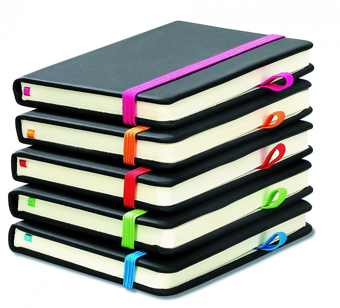 Couverture cartonnée noire mate. Format A6. Composé de 96 feuilles lignées, fermeture par élastique de couleur assorti au passant de stylo et au signet. Existe en 4 coloris. Vendu sans stylo. Livré en sachet individuel. Marquage une couleur compris. Poids : 124 g. Dimensions : 14,2 x 9,2 x 1,5 cm.
