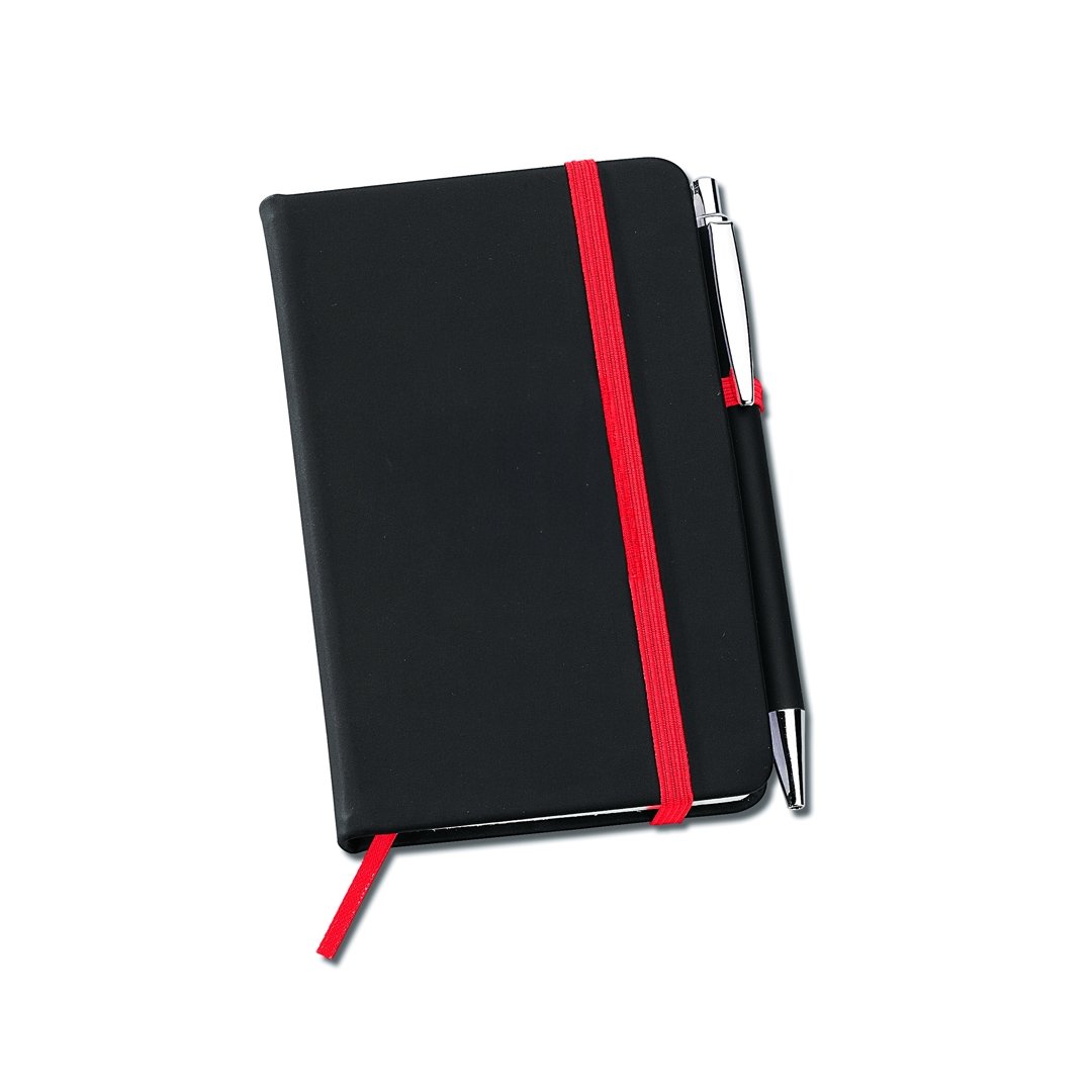 Couverture cartonnée noire mate. Format A6. Composé de 96 feuilles lignées, fermeture par élastique de couleur assorti au passant de stylo et au signet. Existe en 4 coloris. Vendu sans stylo. Livré en sachet individuel. Marquage une couleur compris. Poids : 124 g. Dimensions : 14,2 x 9,2 x 1,5 cm.