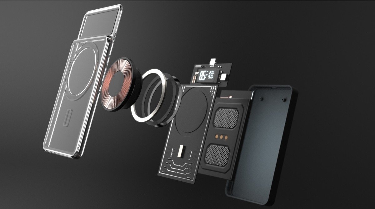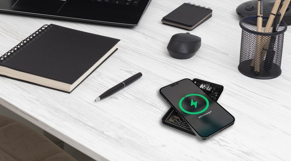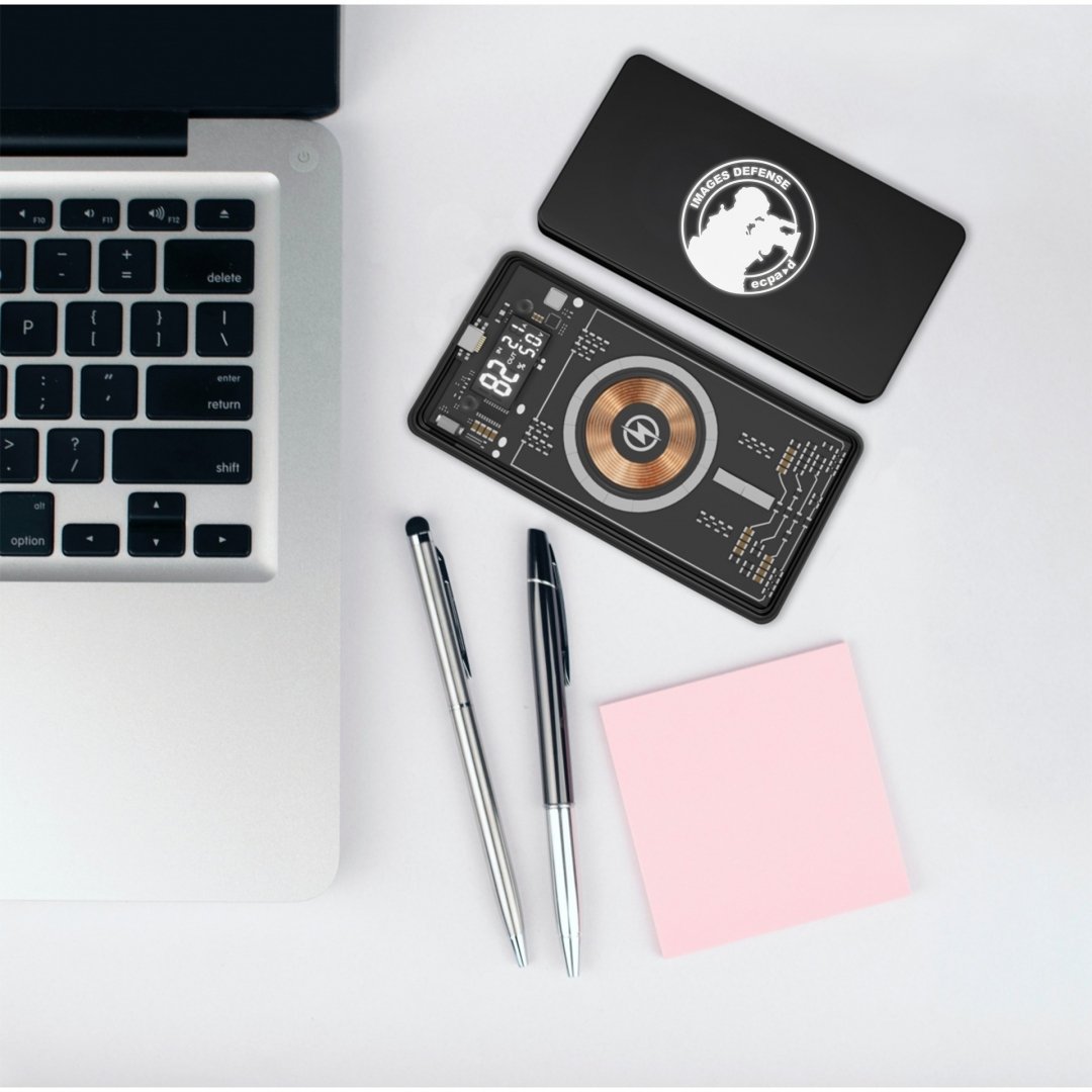 En rubber avec logo lumineux et technologie à induction magnétique permet à la batterie d'être aimantée au téléphone et de le recharger ainsi par induction aimantée. Capacité de 5000 mAh, affichage digital de la batterie et sortie/entrée USB type C. Si votre téléphone ne possède pas la technologie par induction magnétique, vous pouvez apposer l'autocollant au dos du téléphone pour le rendre compatible avec le support magnétique fourni. Marquage laser compris.