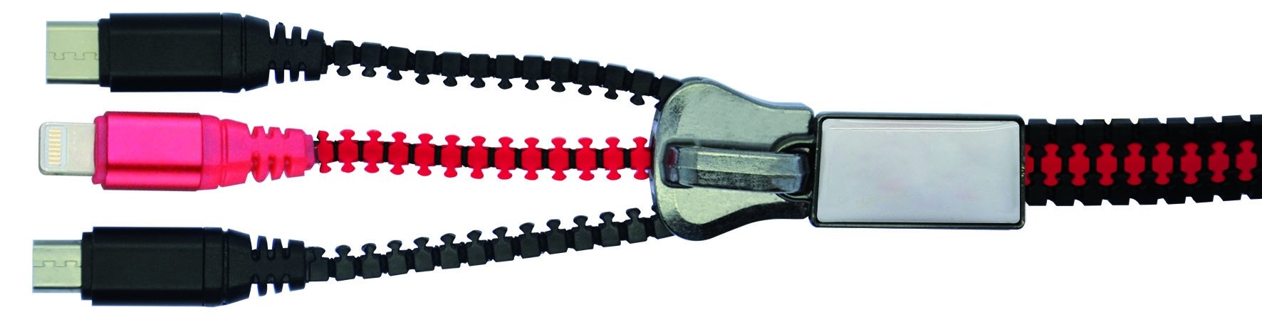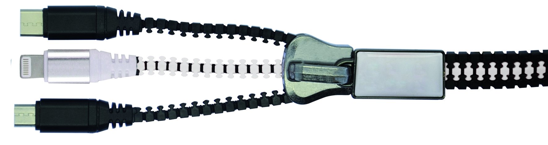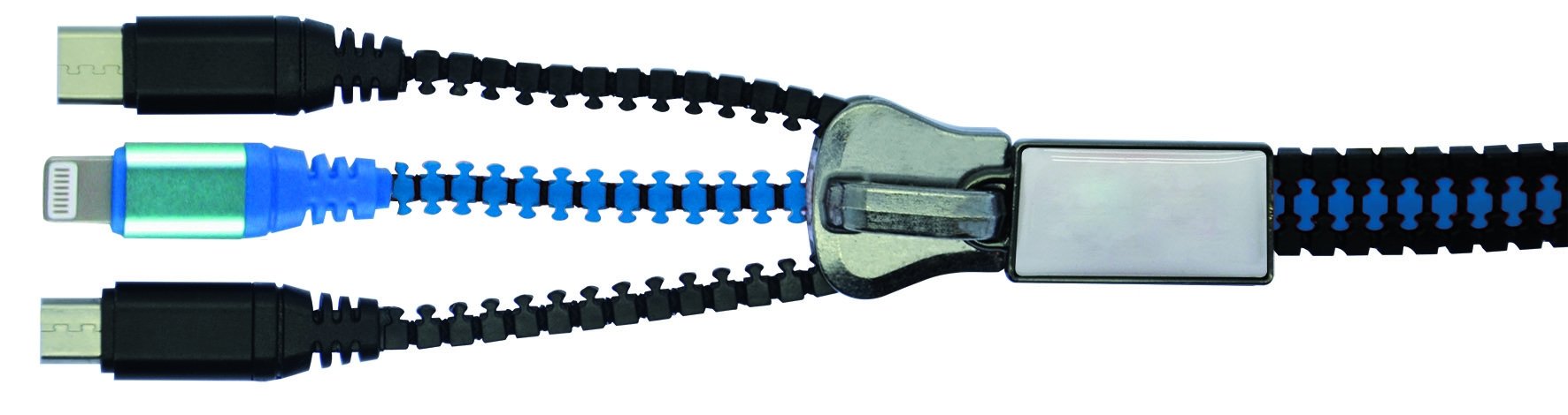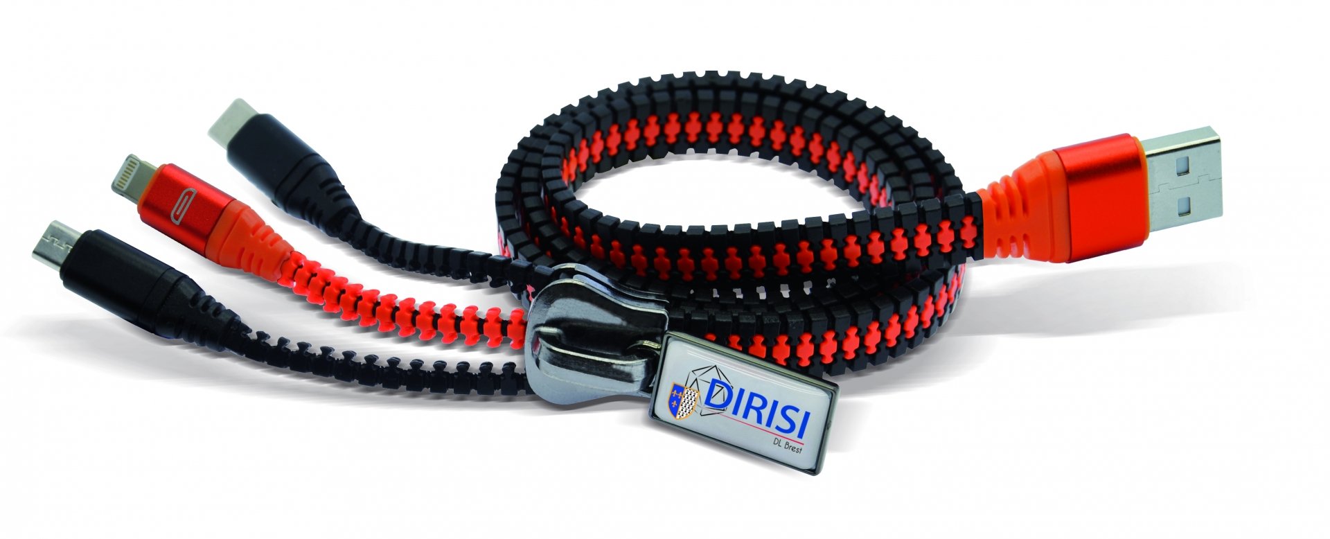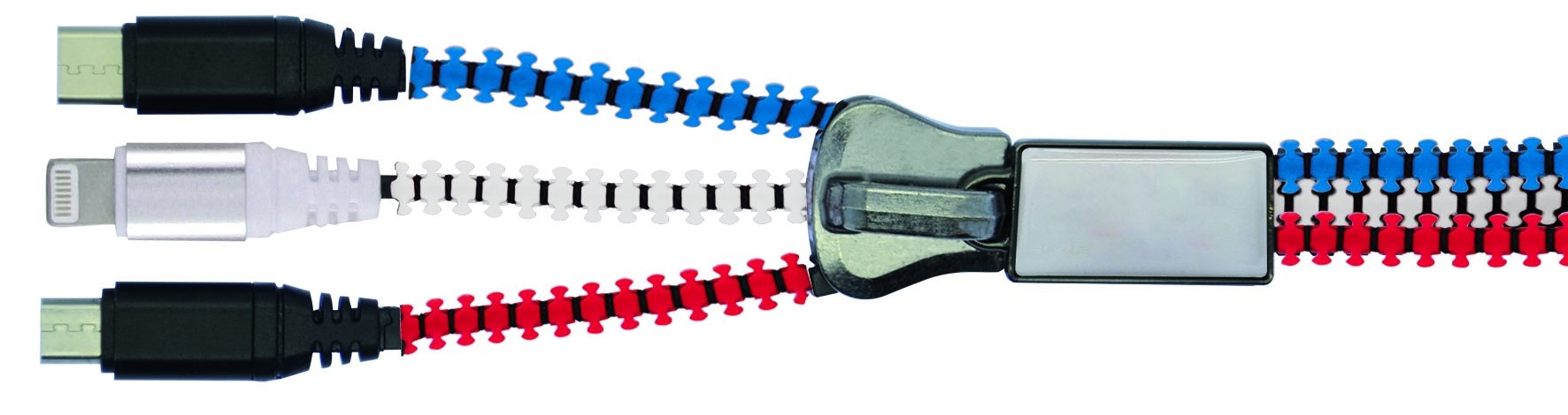 Câble zippé de chargement. Muni de 3 connectiques, il permet la charge de plusieurs appareils en même temps. Celles-ci sont compatibles lightning, micro USB et type C. Il ne possède pas de fonction transfert de données. Existe en 4 coloris. Marquage digital compris.