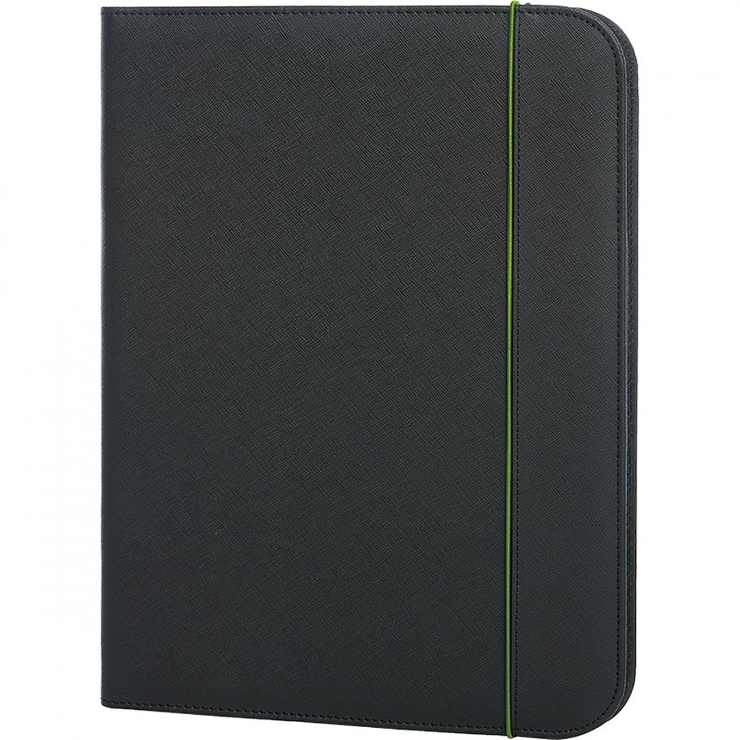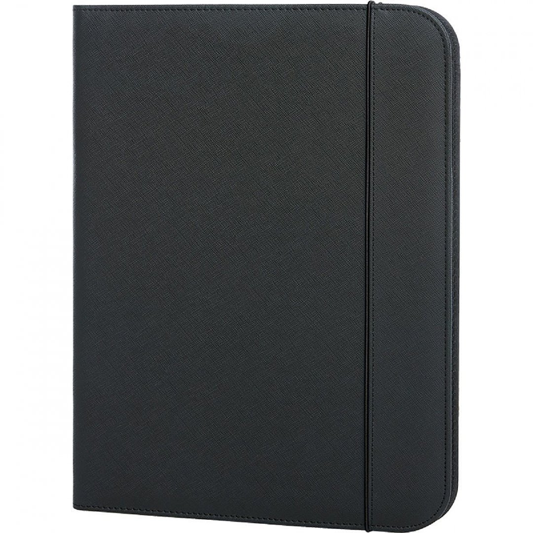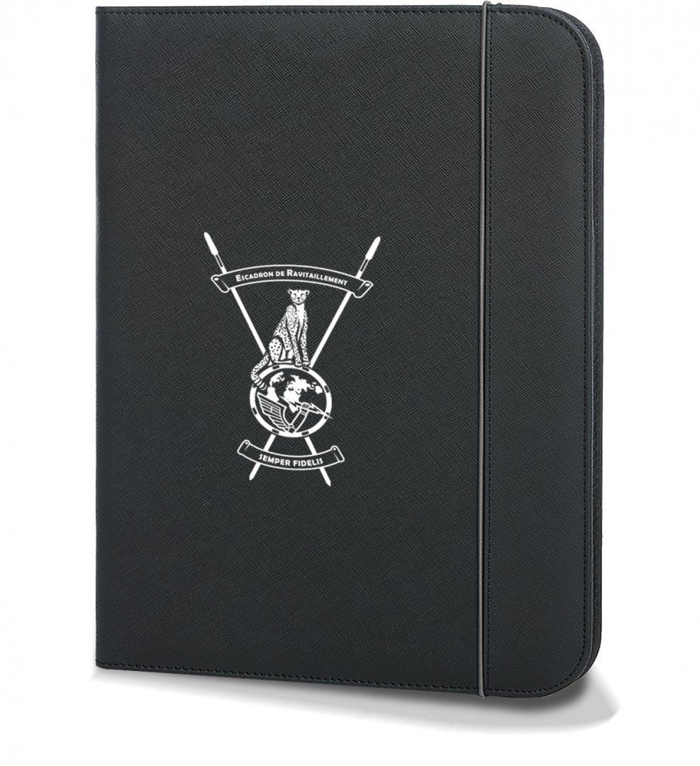 En simili cuir. Éléments de rangements. Poche plate intérieure. Fermeture avec élastique en coloris contrasté. Existe en 5 coloris. Livré en sachet individuel. Marquage une couleur compris. Dimensions : 25 x 32 x 2 cm.