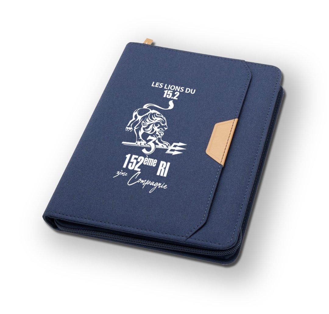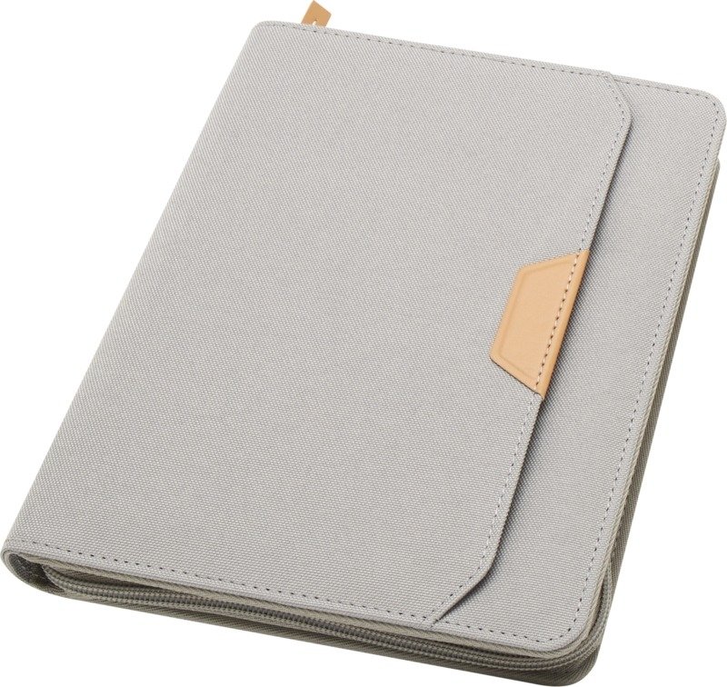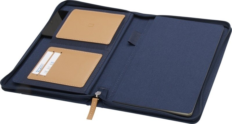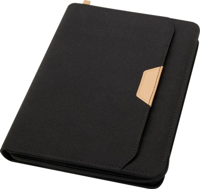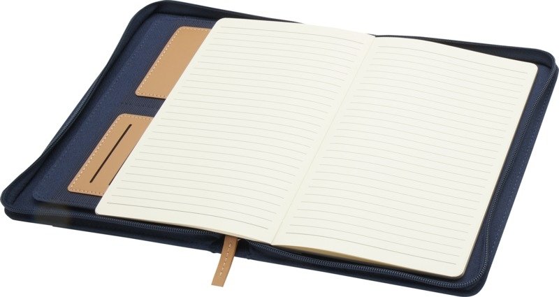 Format A5 avec coins arrondis. Comprend 64 feuilles lignées de couleur crème de 80 g/m2, une fermeture à glissière, une boucle pour stylo et une pochette accordéon. Plastique recyclé PET, Papier certifié FSC. Emballage en polybag individuel. Existe en 3 coloris. Marquage une couleur compris. Poids : 458 g. Dimensions : 22,5 x 18 cm.