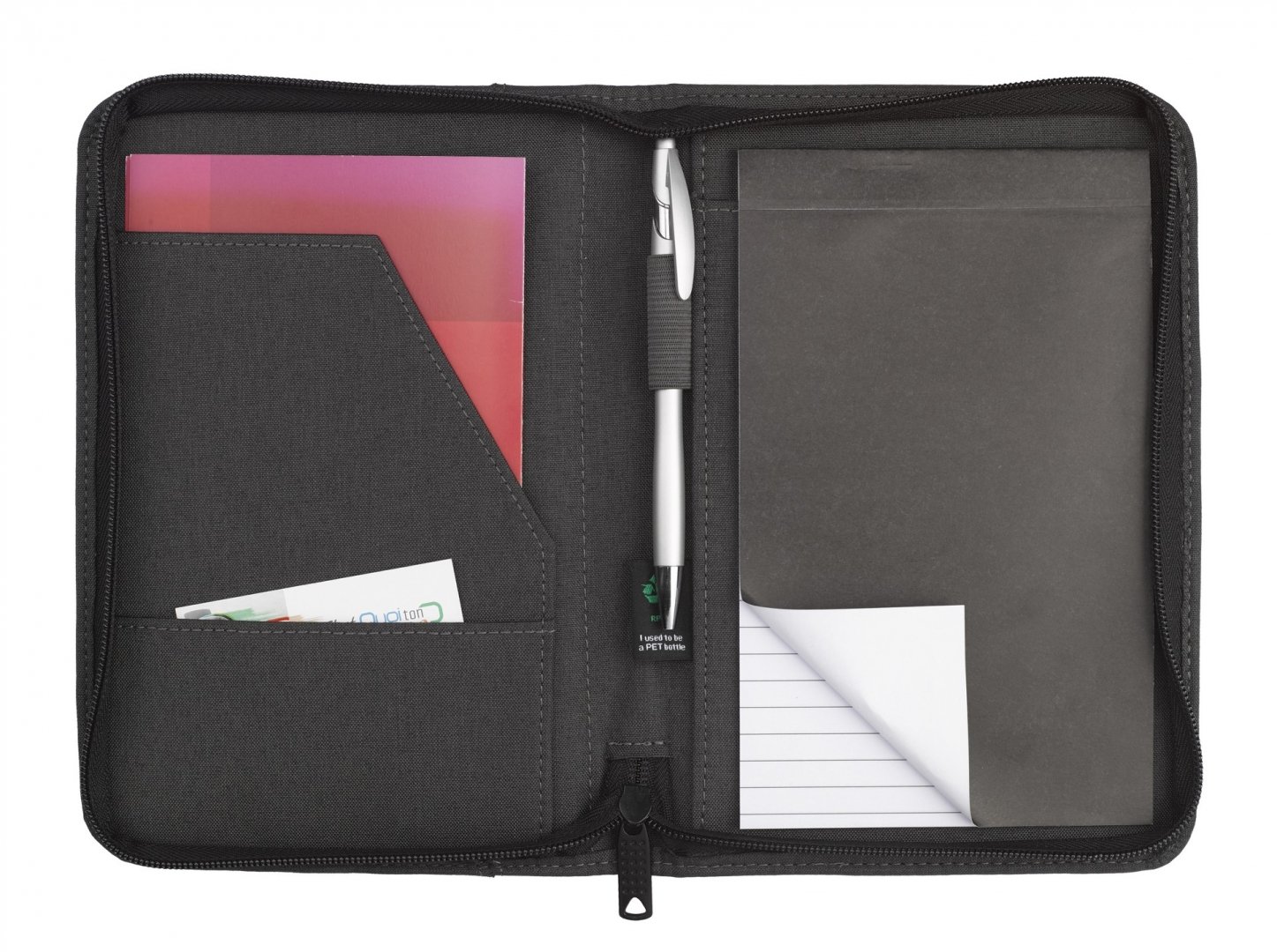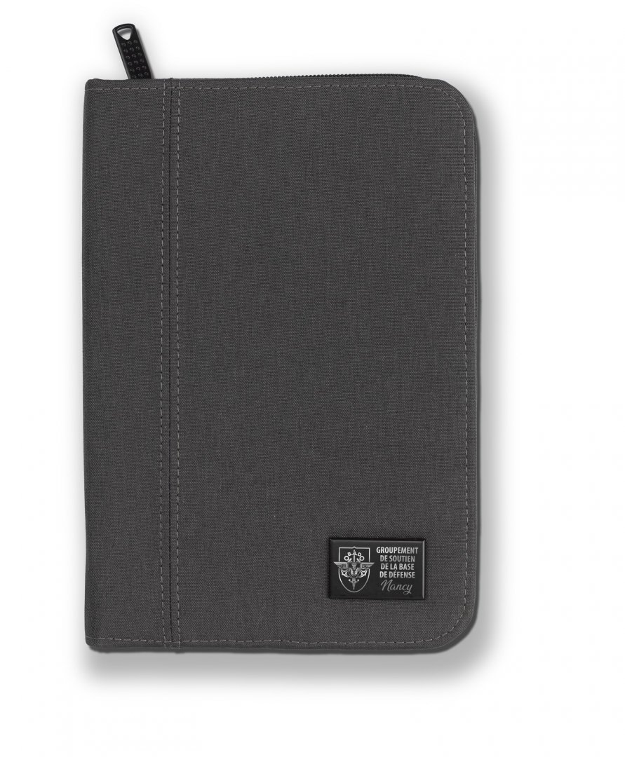 Format A5, en matière RPET, fermeture zippée. Contient un bloc papier FSC de 25 feuilles lignées, avec 2 poches intérieures et un passant pour stylo. Marquage laser compris. Poids : 334 g. Dimensions : 22 x 15,4 x 2,3 cm.