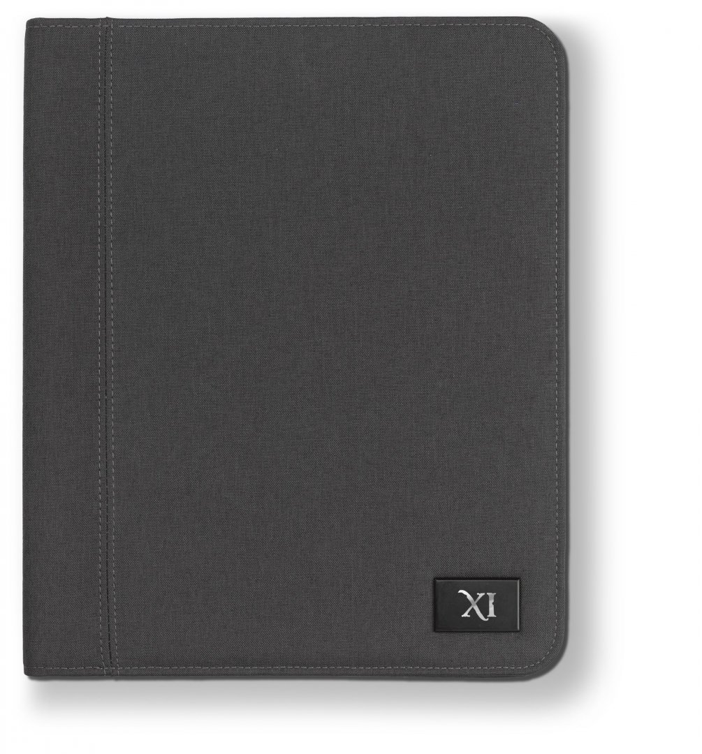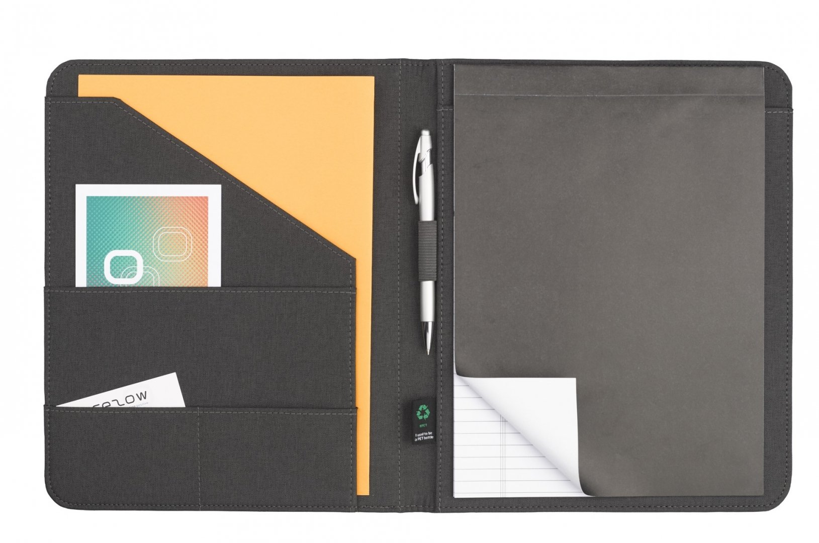 Format A4. En RPET, contient un bloc papier FSC de 25 feuilles lignées avec une plaque en métal noire mate, 4 poches intérieures et un passant pour le stylo. Marquage laser compris. Poids : 630 g. Dimensions : 30,7 x 25,1 x2,3 cm.