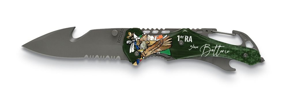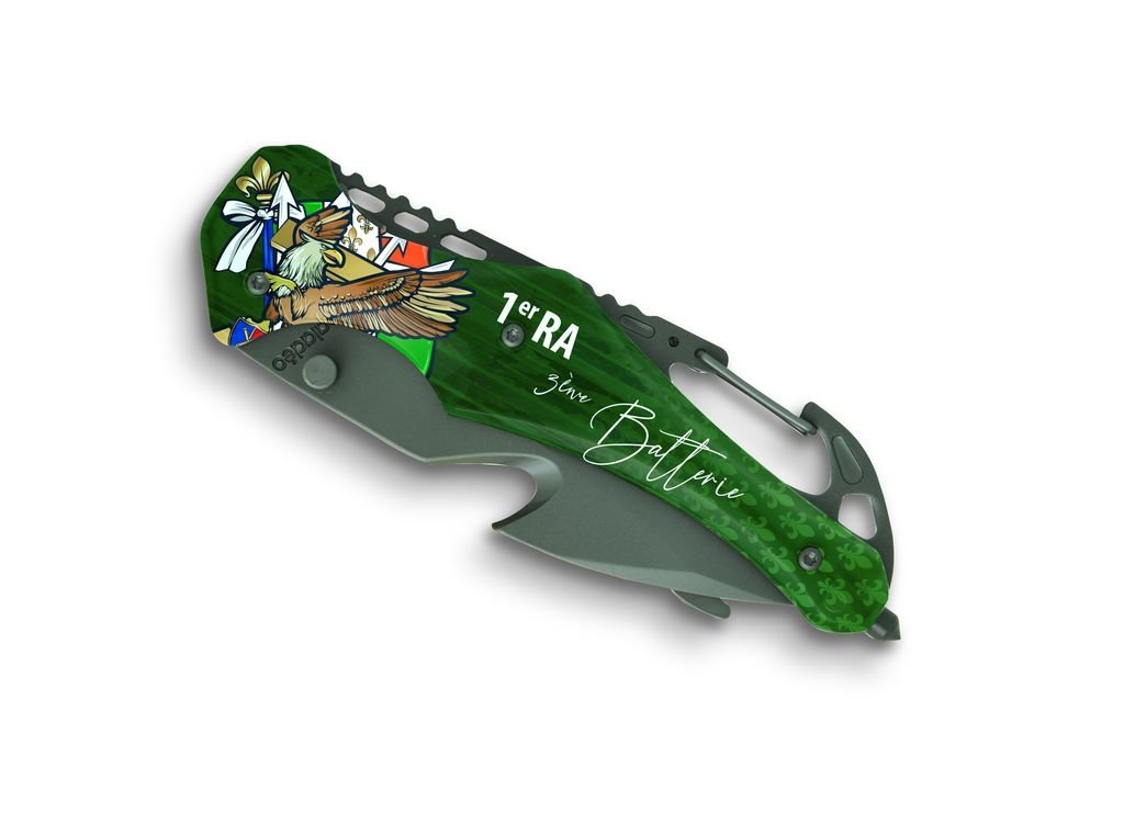 Lame en acier inoxydable 420 semi-dentée, revêtement titane. Manche recouvert de plastique transparent. Cran de sécurité et mousqueton d'accroche. 4 fonctions : coupe-ceinture, coupe-corde, marteau brise-vitre et décapsuleur. Livré en boîte cartonnée. Sur demande nomination individuelle gravée sur la lame. Marquage laser compris. Poids : 148 g. Dimensions fermées : 11,9 x 4 x 2 cm.