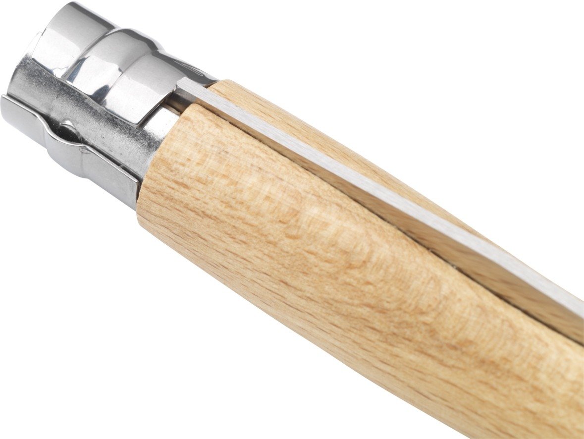 Lame en acier inoxydable. Manche est en bois de hêtre, recouvert d'une couche de vernis pour le protéger de l'humidité et de la saleté. 95 % du bois provient d'entreprises françaises gérées durablement. La poignée est munie d'un cordon en cuir. Lorsqu'il est ouvert, le couteau a une longueur de 18 cm et est sécurisé par un système de verrouillage Virobloc®. Marquage laser compris. Poids : 36 g. Dimensions fermées : 17 x 2,5 x 1,8 cm.