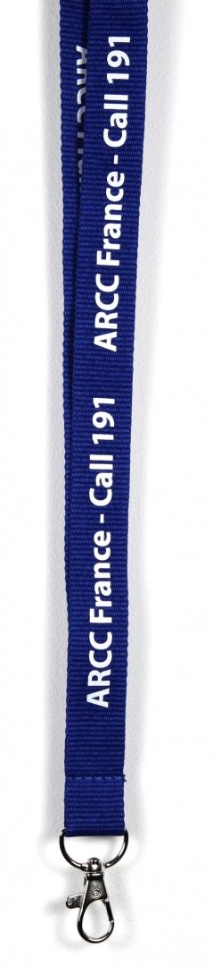 Sangle 90 cm, 100 % polyester. Attache mousqueton incluse. Marquage 1 couleur inclus une face. Options enrouleur, boucle de séparation, porte-carte PVC et emballage individuel en supplément. Poids : 18 g. Dimensions : 90 x 2,5 cm.