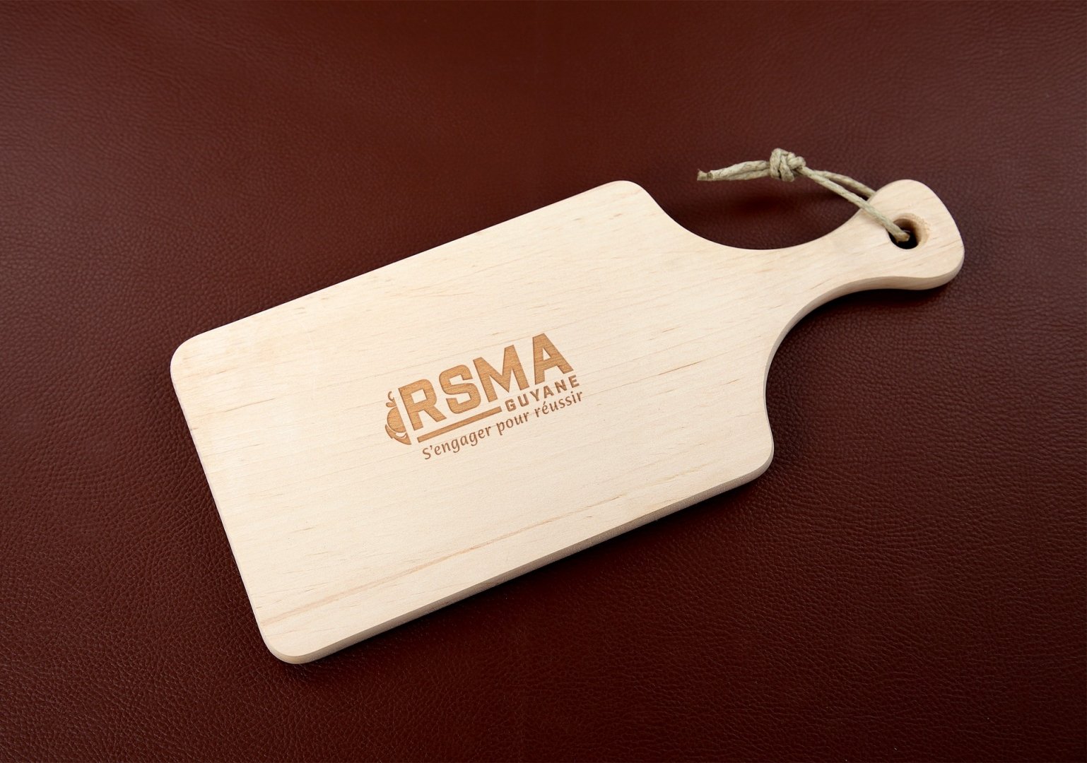 En bois d'aulne, avec poignée et cordelette, certifié contact alimentaire EN19352024. Produit naturel pouvant présenter des variations de couleurs et de tailles. Marquage laser compris. Poids : 216 g. Dimensions : 32 x 14 x 1 à 1.2 cm.
