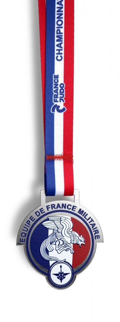 En métal, finition or, argent ou bronze. Relief 2D. Avec ruban cousu et sublimé. Livré en polybag individuel. Impression quadri une face et découpe à la forme. Poids : 35 g. Dimensions : Ø 6,5 x 0,02 cm.