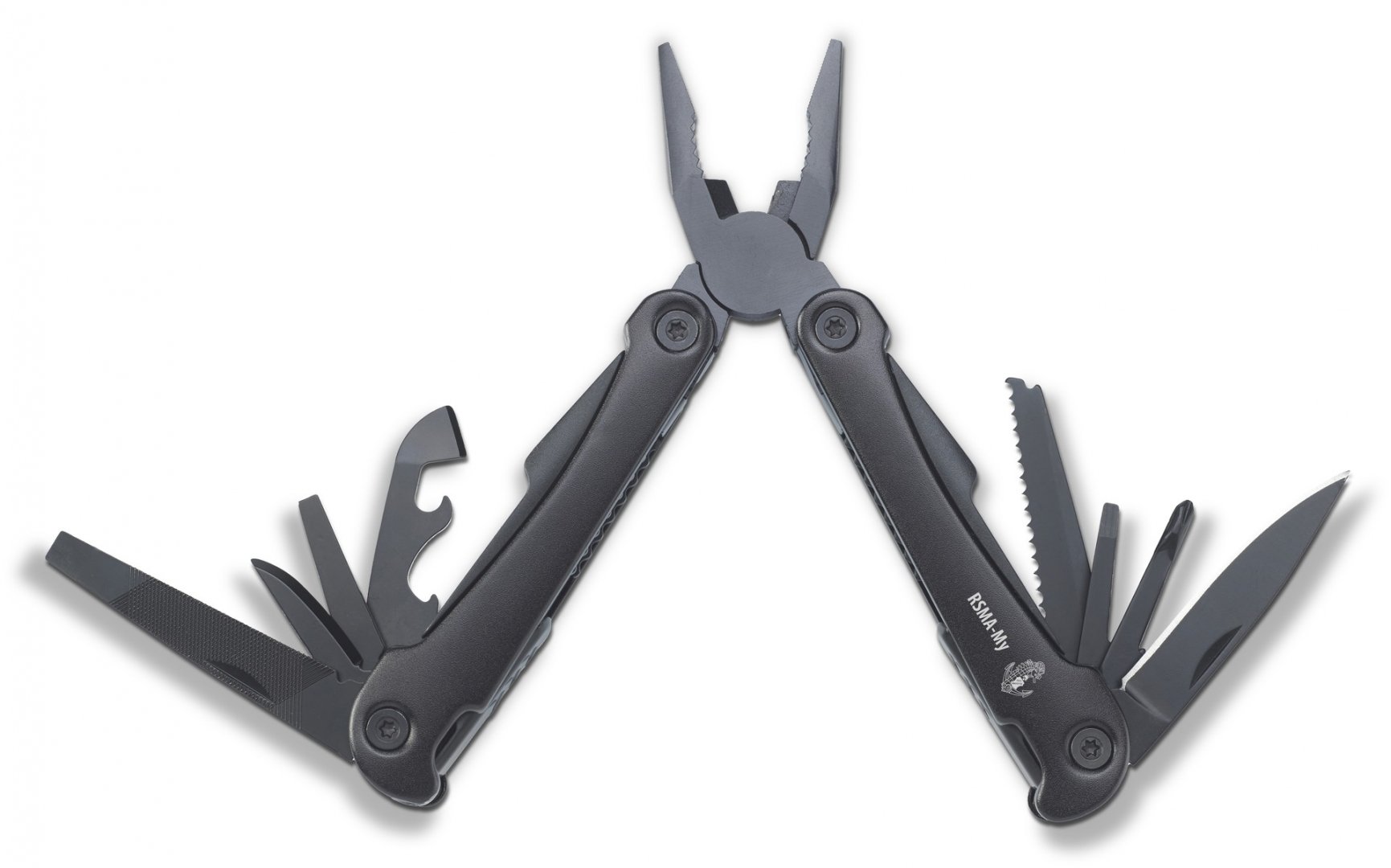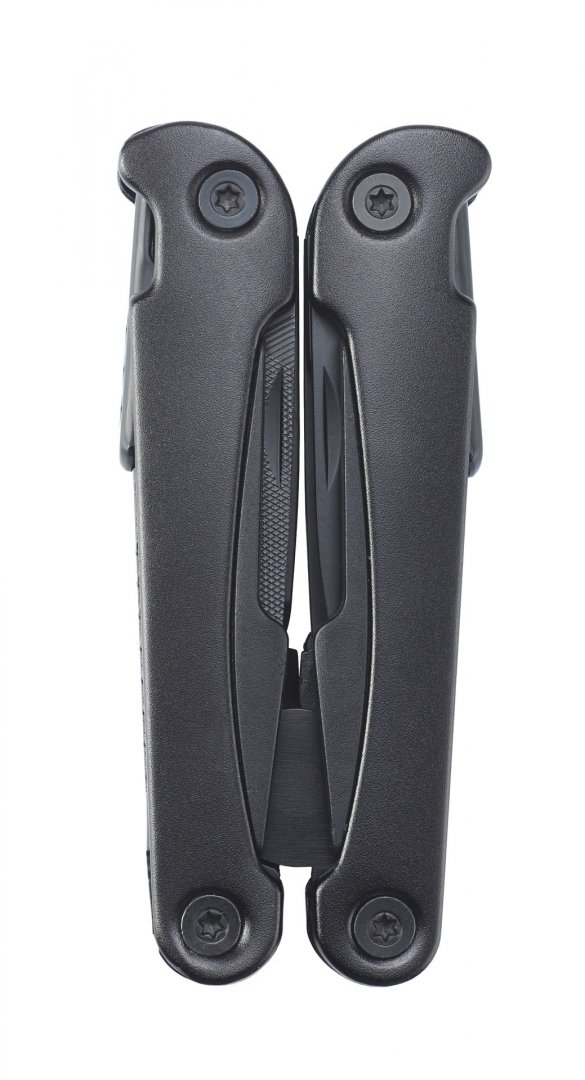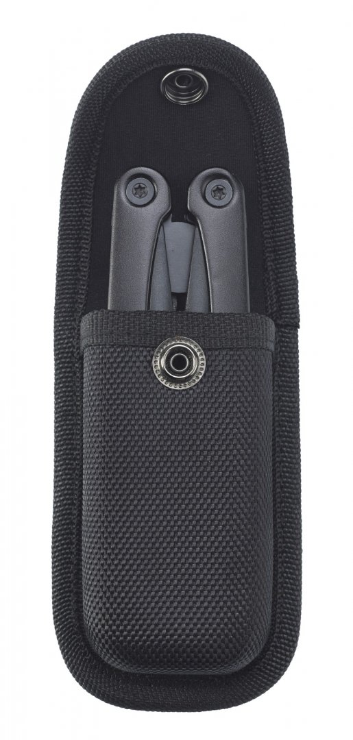 En aluminium, pince, lime, décapsuleur, ouvre-boîte, scie, couteaux, tournevis plat, tournevis cruciforme, système autobloquant, finition noire mate. Livrée avec housse nylon renforcée, fermeture pression et passe ceinture. Marquage laser compris. Poids : 286 g. Dimensions fermées : 11,5 x 5,6 cm.