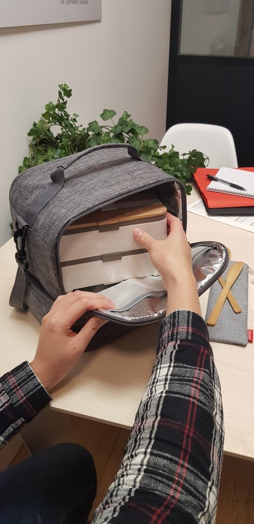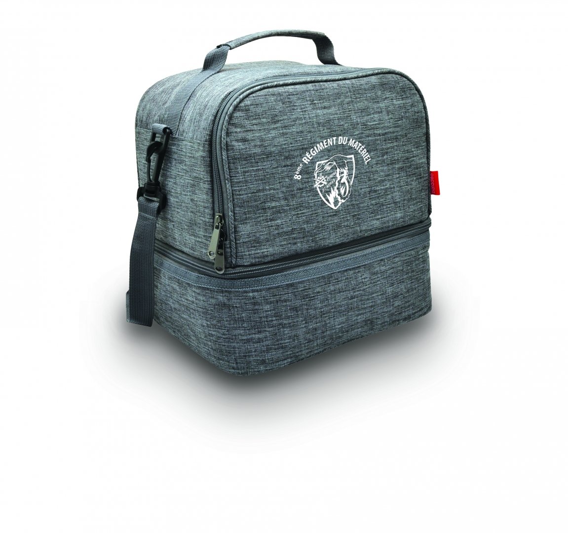 Isotherme double compartiment en tissu wulong gris chiné. Finition isolante de 3 mm d'épaisseur. Possibilité d'insérer une carte de visite. Poignées renforcées et rembourrées pour une meilleure prise en main. Marquage transfert compris. Poids : 370 g. Dimensions : 27 x 25 x 20 cm.