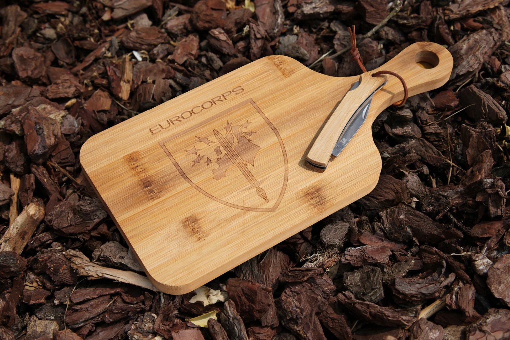En bambou et acier inoxydable. Couteau pliant à manche doté d'une cordelette en cuir. Livré en boîte individuelle. Marquage laser sur la planche 10 x 10 cm maxi compris (en option sur le couteau). Poids : 300 g. Dimensions : 29 x 14 x 1,2 cm.