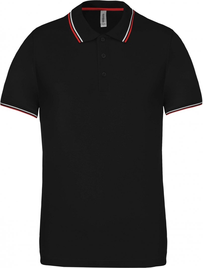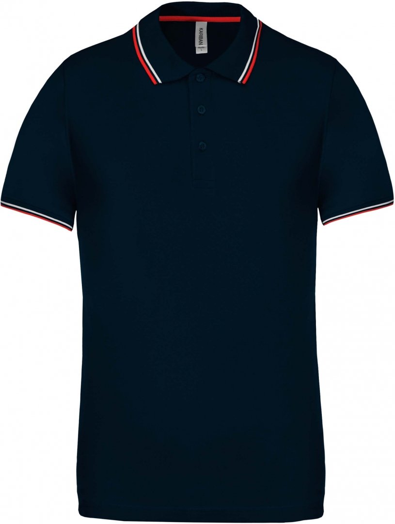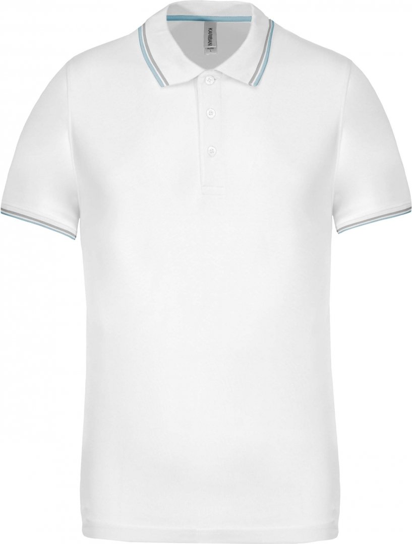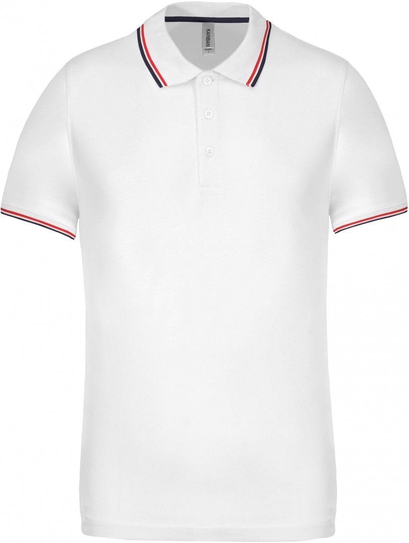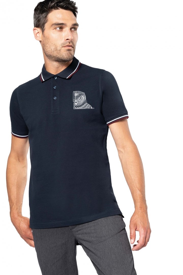100 % coton piqué. Patte de boutonnage 3 boutons. Bande de propreté contrastée encolure et fentes côtés. Finitions bord-côte avec liserés contrastés col et bas de manches. Double aiguille bas de vêtement. Existe en 15 coloris. Marquage une couleur, une position compris. Densité : 220 g/m².