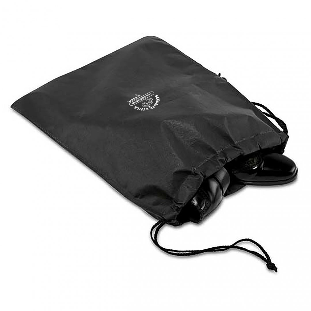Poche de rangement pour chaussures avec cordon de serrage. Matière non-tissé 80 g/m². Emballage en sachet individuel. Marquage une couleur compris. Poids : 40 g. Dimensions : 36 x 42 cm.