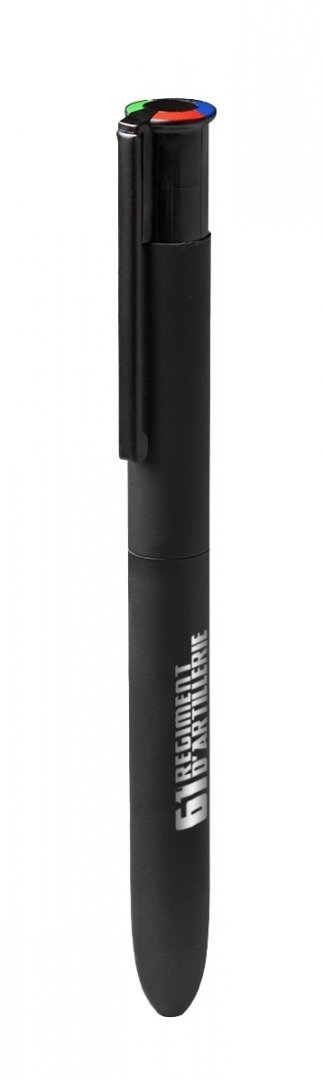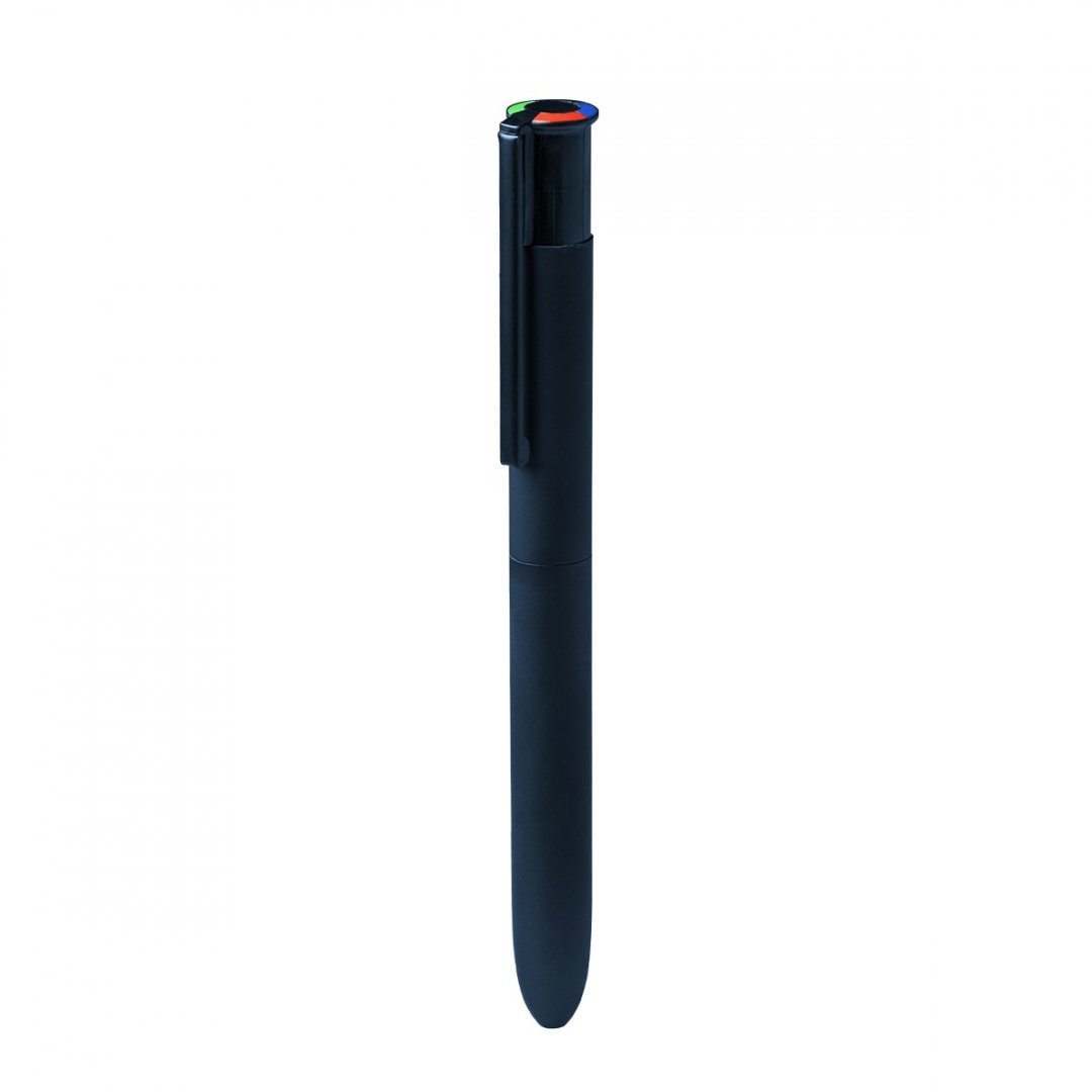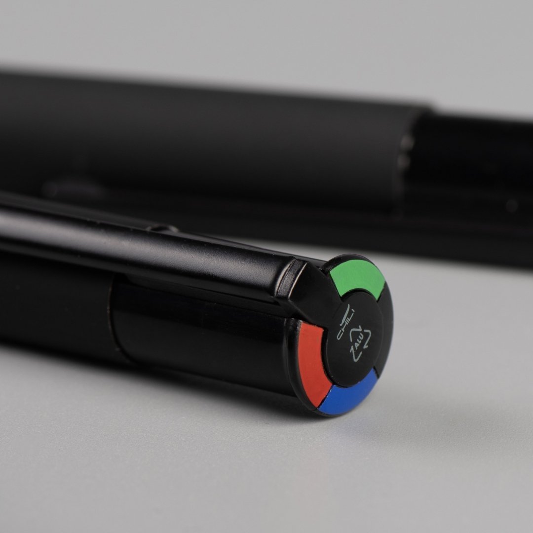 En aluminium recyclé. Fonction 4 couleurs. Corps large et confortable et finition toucher soft. Encre allemande longue durée. Existe en 2 coloris. Marquage laser compris sur le corps. Poids : 21 g. Dimensions : Ø 1,6 x 14,3 cm.