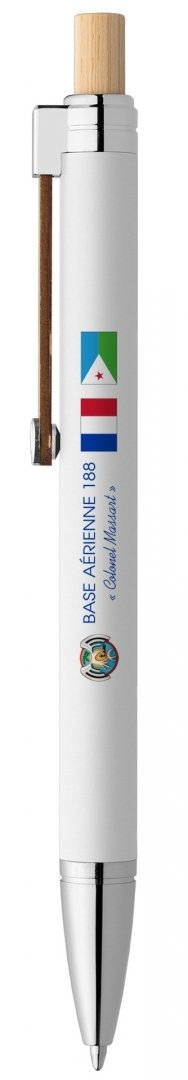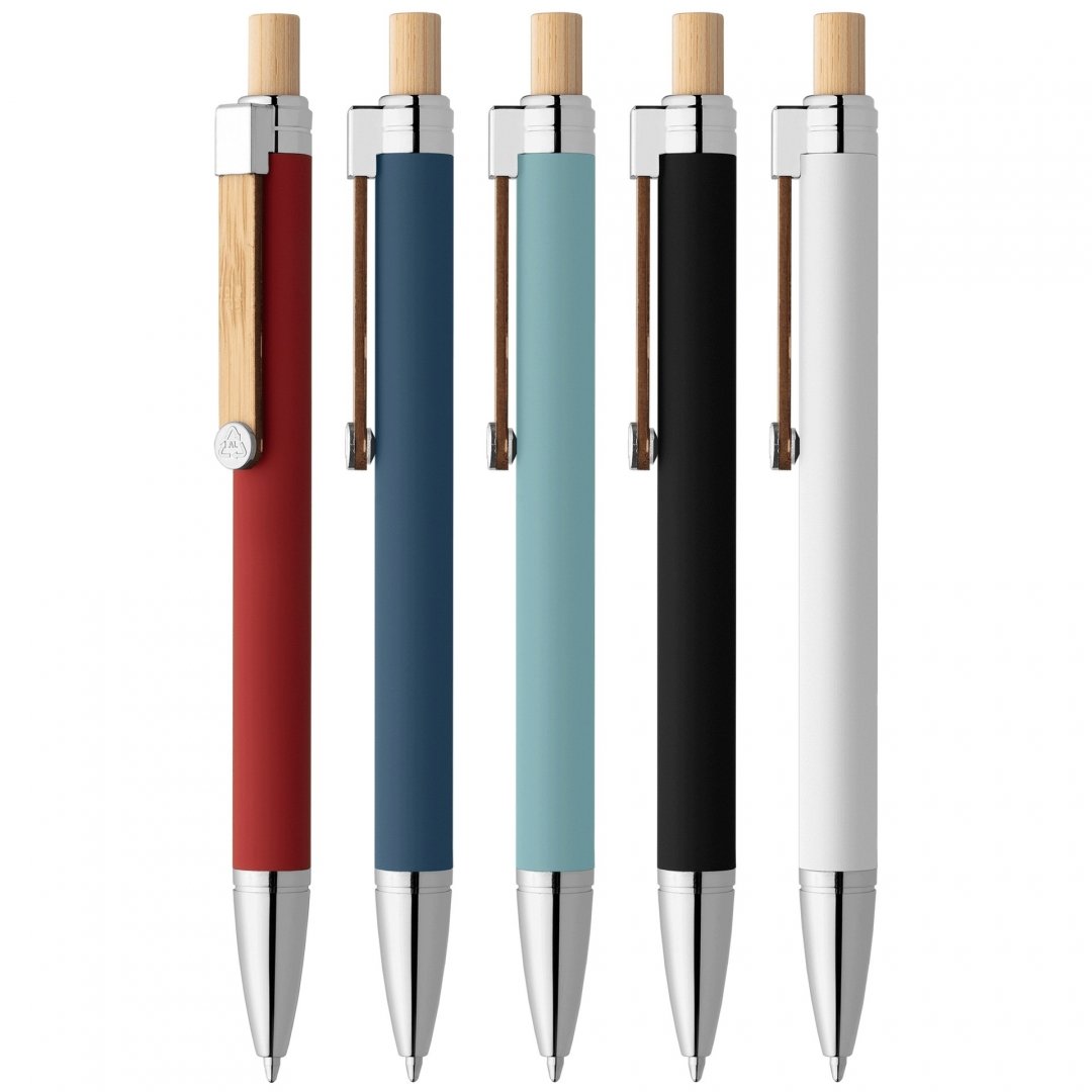 En aluminium recyclé avec une finition peinte en caoutchouc pour une prise en main lisse et confortable. La pointe et le haut du stylo en argent chromé, fabriqués à partir de plastique RABS, sont complétés par des accents de bambou sur le piston et l'agrafe. Un disque chromé avec un symbole recyclé moulé orne l'extrémité du clip. Existe en 5 coloris. Marquage quadri compris. Poids : 17 g. Dimensions : Ø 10,6 x 142 cm.