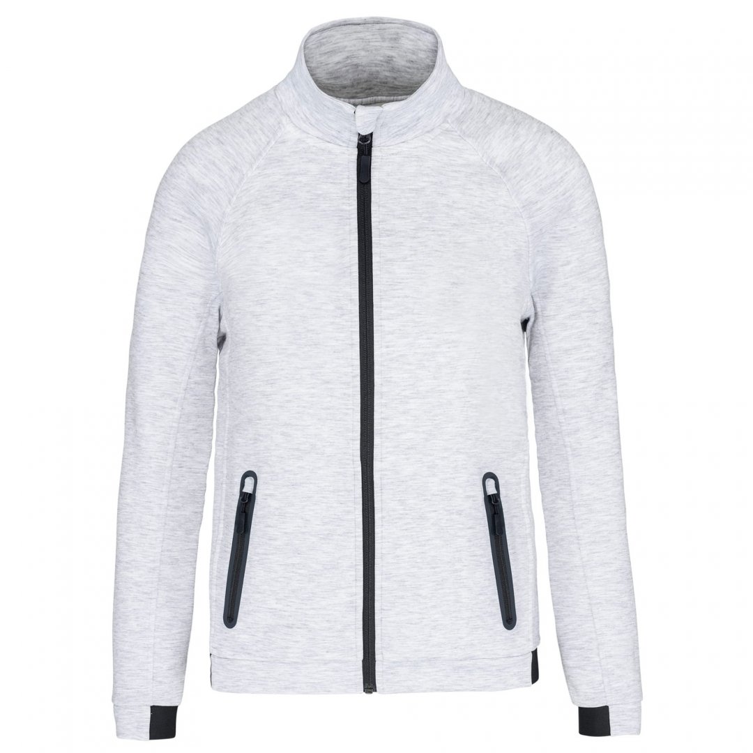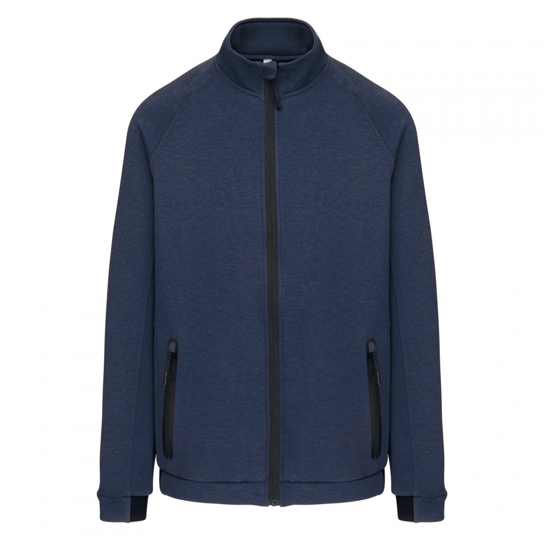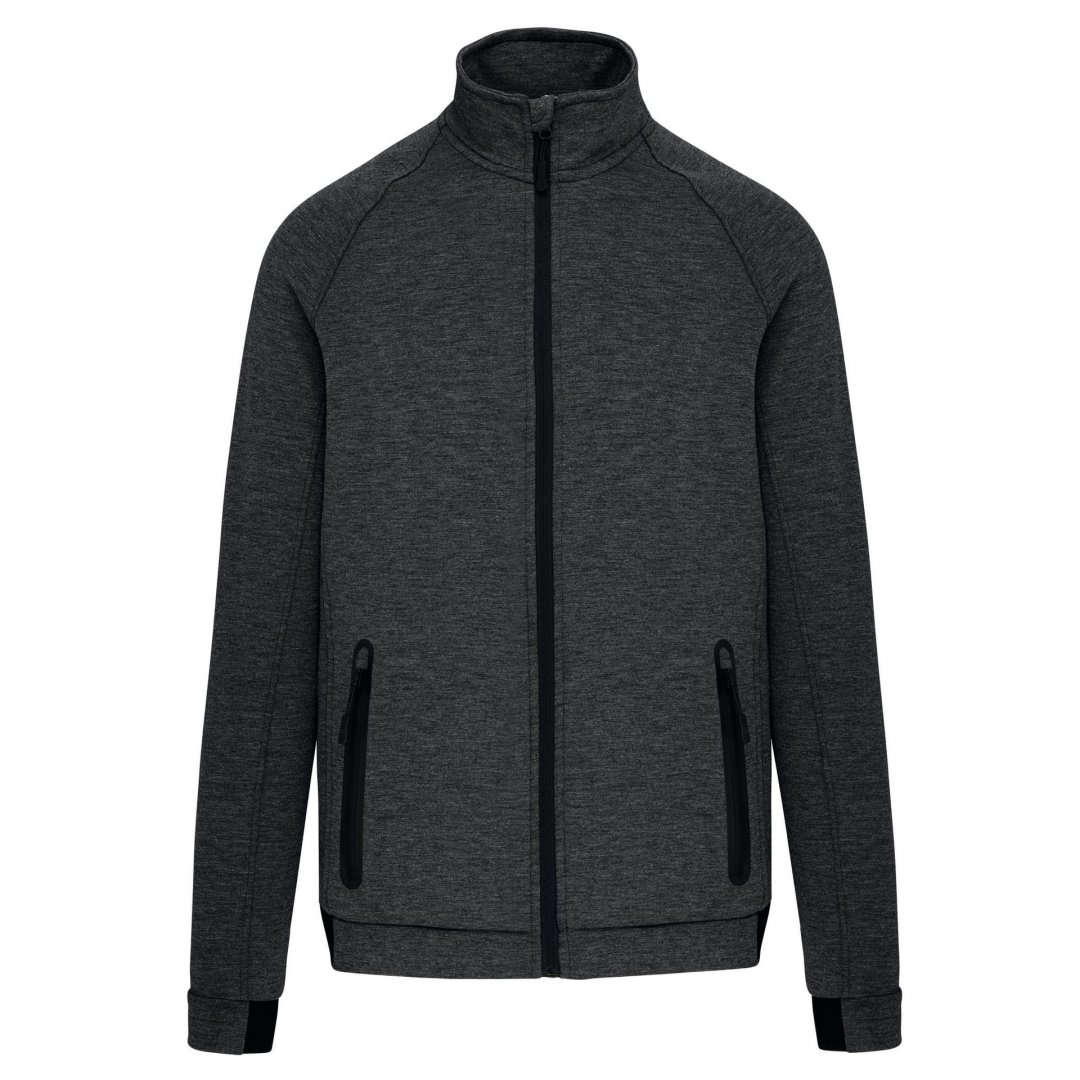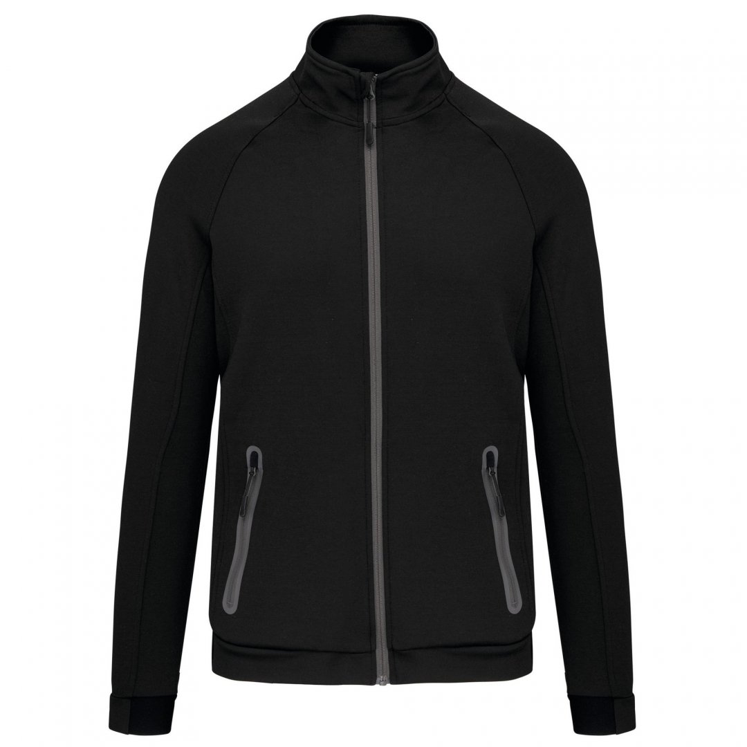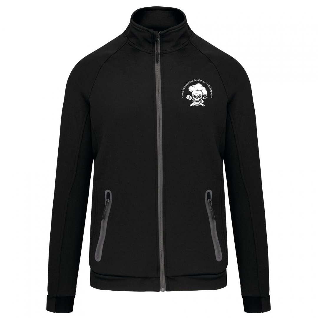 94 % polyester, 6 % élasthanne. Matière ultra confortable. Fermeture zippée. 2 poches avant zippées finition thermosoudée. Bas de manches et de vêtement resserrés avec une partie élastiquée. Existe en 4 coloris. Marquage une couleur, une position compris. Poids : 310 g/m². Tailles : XS à 3 XL.