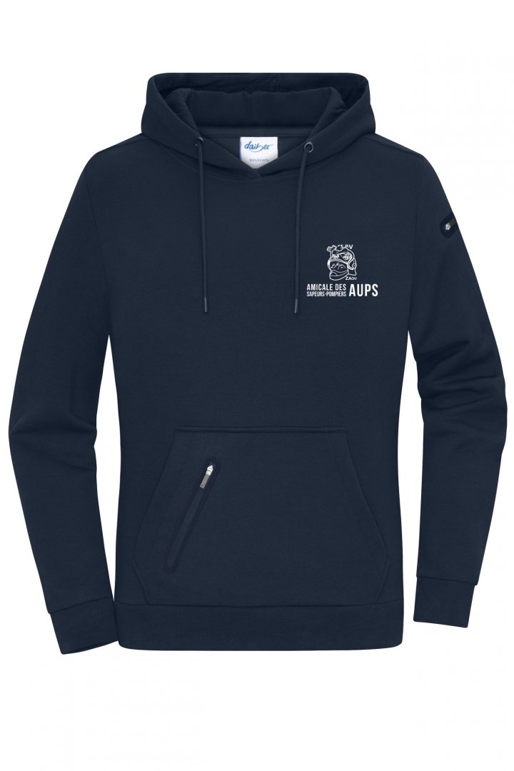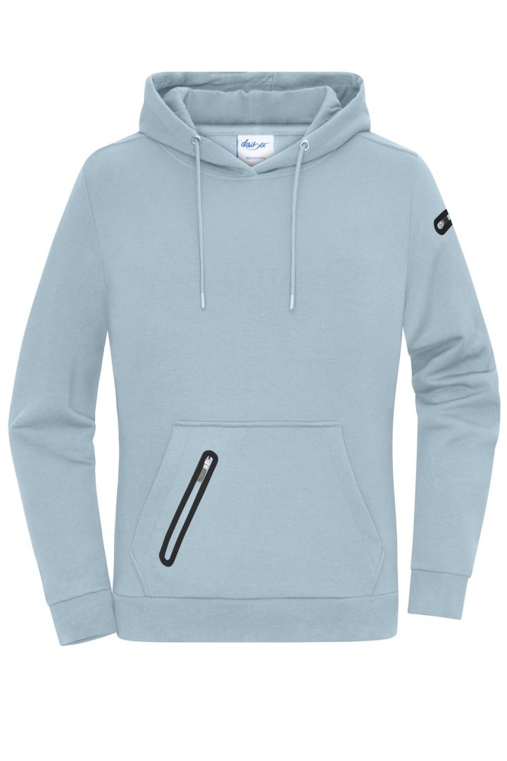 63 % coton bio ring-spun, 33 % polyester recyclé issu de bouteilles en PET et 4 % élasthanne. Coupe droite et intérieur en tricot double interlock. Capuche doublée avec cordon de serrage, bords en côtes avec élasthanne. Poche kangourou dotée d'une poche zippée et une poche supplémentaire zippée sur l'épaule. Existe en 4 coloris. Marquage une position, une couleur compris. Densité : 360 g/m². Tailles : S à 3XL.