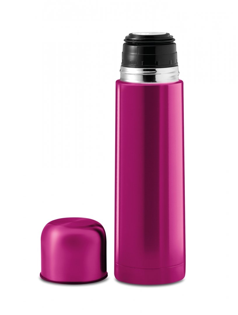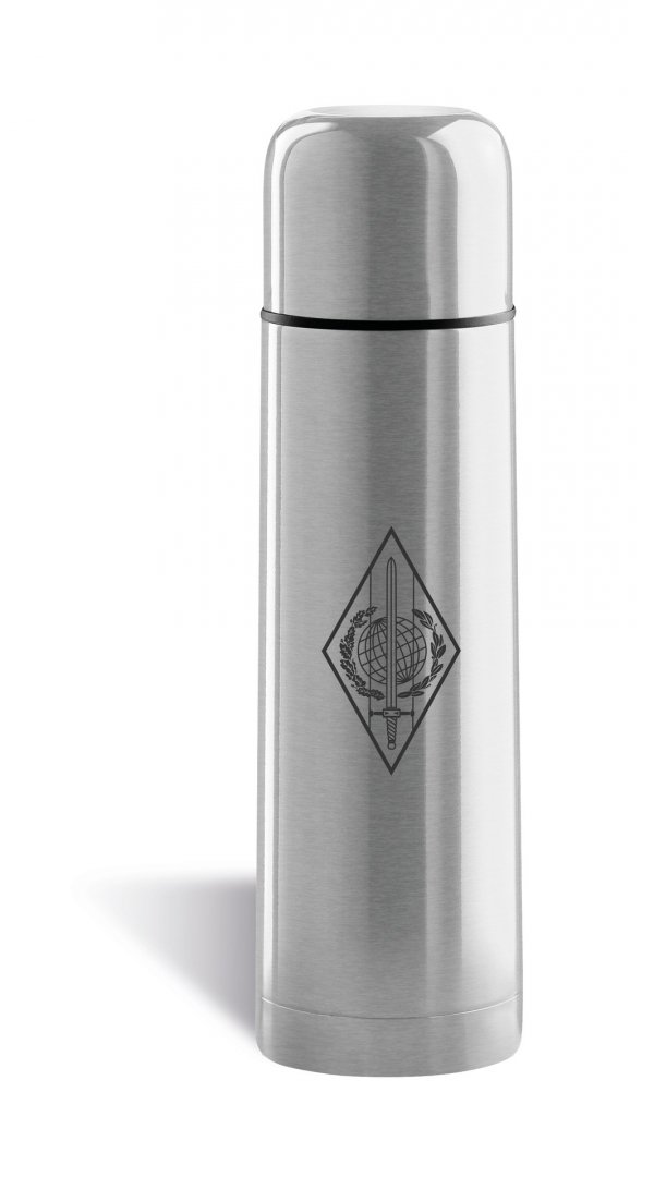 En acier inoxydable. Double paroi vide d'air, bouton-poussoir de fermeture et mug. Contenance : 500 ml. Existe en 11 coloris. Livrée sous boîte individuelle cartonnée. Marquage laser compris. Poids : 386 g. Dimensions : Ø 6,8 x 25,5 cm.